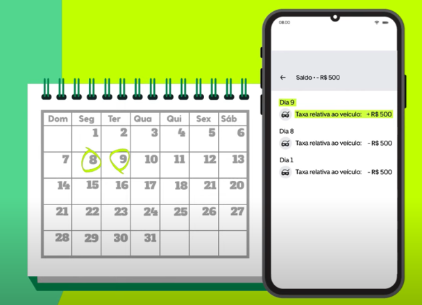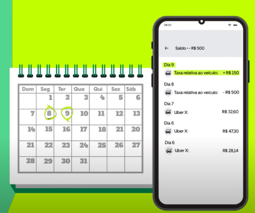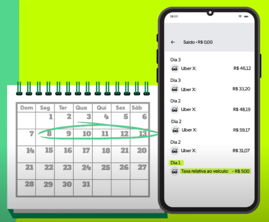 do valor do aluguel semanal. Assim, o valor restante do aluguel da semana será cobrado por cartão ou boleto. Olha um exemplo do funcionamento: Já a retenção total acontece quando você tem mais do que o valor total da sua semanal. Se liga: • Na segunda-feira, o valor total do seu aluguel será descontado do saldo no app da Uber. Sendo assim, ele será zerado. Na terça-feira, você vai apenas visualizar o valor da próxima semanal no app da Uber. Conte pra gente, Zarper: você sabe a diferença entre Flex Pay e Instant Pay? Se você leu a pergunta e ainda não sabe a diferença, nós te explicamos. Flex Pay e Instant Pay são as duas opções pra recebimento dos ganhos na Uber. Bora entender cada uma delas? A modalidade é pro motorista de app que tem a Uber Conta (Digio). Assim, quando o saldo ficar positivo, seus ganhos são automaticamente transferidos pra sua conta digital após sua corrida. Maneiro, né? É uma opção pra quando o motorista de app não tem a Uber Conta (Digio). Assim, basta pedir a liberação do dinheiro quando seu saldo estiver positivo. Se liga: o recebimento automático dos ganhos ou a necessidade de solicitação de saque dependem do tipo de conta que você tem na Uber. Fique atento, viu! Sim, logo após o pagamento do valor do aluguel semanal. Os motoristas que têm a Uber Conta (Digio), habilitados para Instant Pay. Após a quitação do aluguel, eles receberão automaticamente seus ganhos na Conta Uber (Digio). Pra receberem seus ganhos, eles deverão solicitar o saque do saldo positivo após a quitação do aluguel. Quando o aluguel da semana atual é quitado, o da próxima semana já aparece no app da Uber apenas para visualização, você não é cobrado duas vezes. É mais uma alternativa pra você ter a previsão do pagamento e se organizar. Agora que você já sabe tudo sobre o novo fluxo de ganhos dos motoristas de app, já tá pronto pra zarpar? Então confira como funciona o aluguel de carros pra aplicativos e vem com a gente!Antigo fluxo de liberação de ganhos Uber